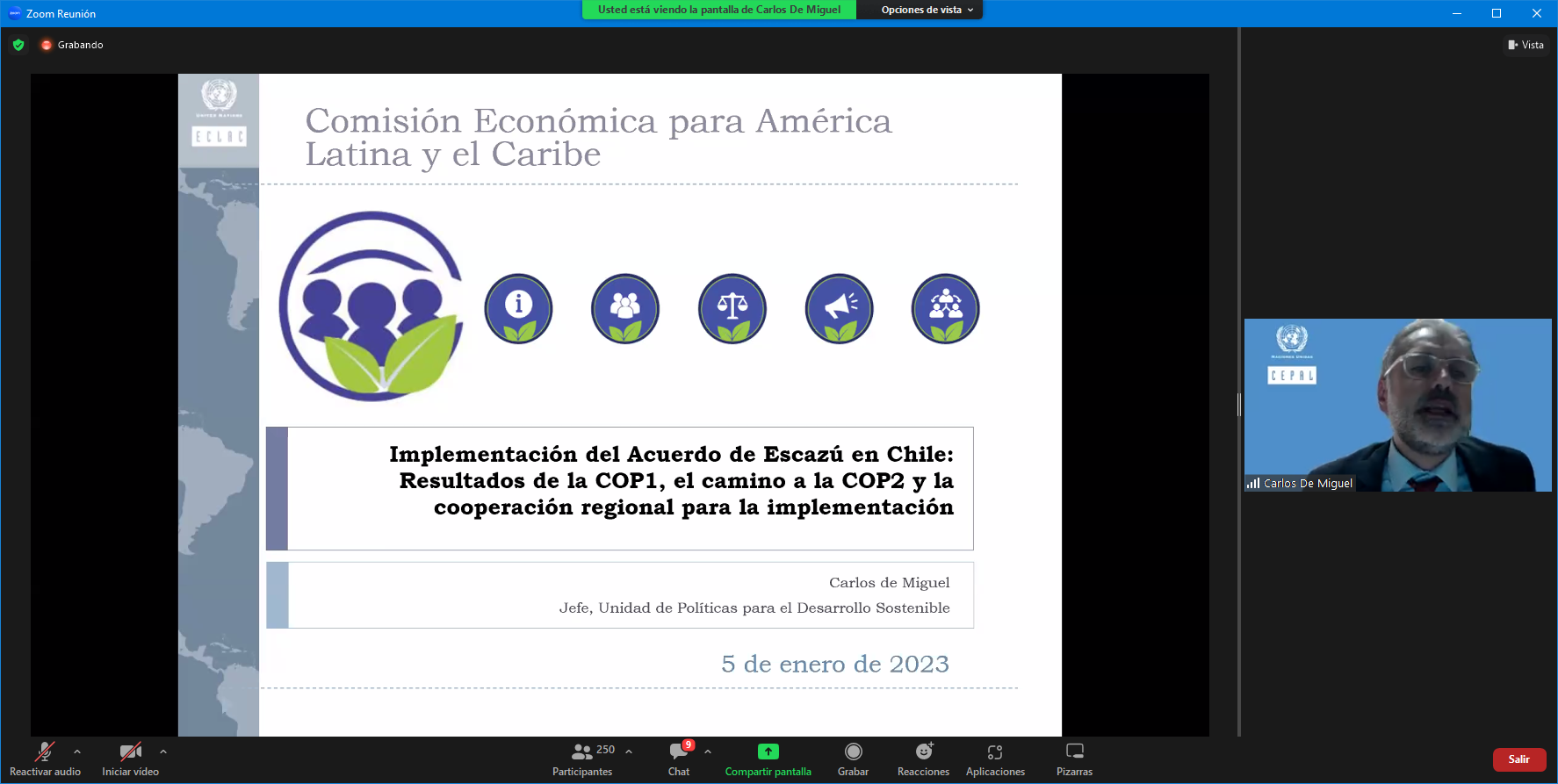 La jornada cerró con la presentación del jefe de la Unidad de Políticas para el Desarrollo Sostenible de CEPAL, Carlos de Miguel, sobre los resultados de la COP1 y el camino para la COP2 resaltando la importancia de que los países avancen en la aplicación plena y efectiva del acuerdo y que, para ello, desde dicha organización internacional, están apoyando a países entre los que se encuentra Chile, en una hoja de ruta de implementación.