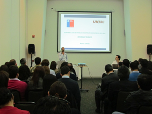 El taller fue realizado por los profesionales del SEA Christian Bustos, quien abordó la aplicación de la Guía; la jefa del Departamento de Estudios, Claudia Valenzuela quien la explicó, y el investigador del Departamento de Geofísica de la Universidad de Chile, Rainer Schmitz, que entregó el informe técnico y fundamentos del documento.