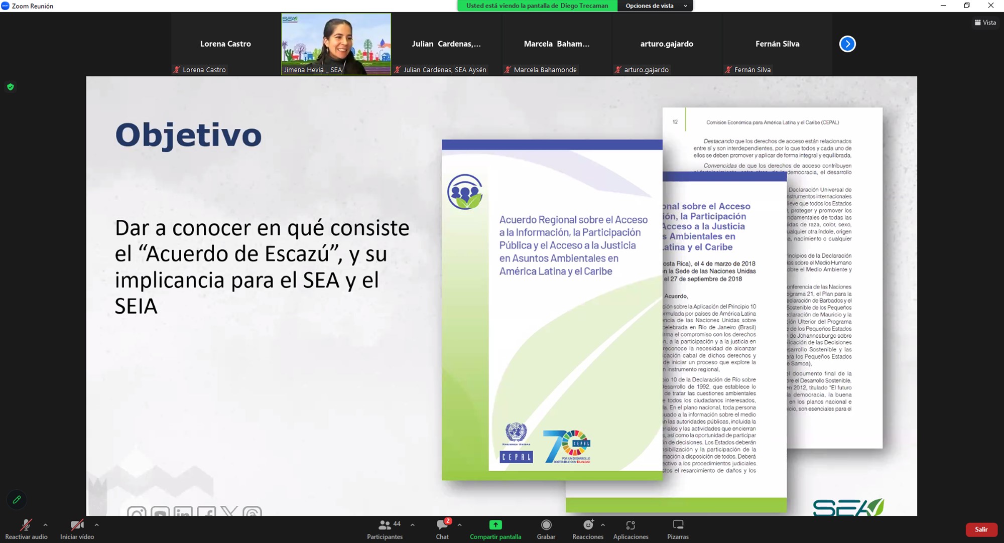 Con una alta presencia de funcionarios regionales de los Órganos de la Administración del Estado con Competencia Ambiental (Oaeca) de la Región de Aysén, el martes 22 de agosto se realizó una capacitación denominada "Acuerdo de Escazú: Perspectivas para el SEA y SEIA”.