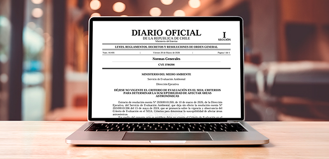 Este viernes 20 de marzo de 2026 se publicó en el Diario Oficial el extracto de la Resolución Exenta N°202699101269 del 10 de marzo de 2026 del Servicio de Evaluación Ambiental que retira la vigencia al “Criterio de Evaluación en el SEIA: Criterios para determinar la susceptibilidad de afectar áreas astronómicas”.