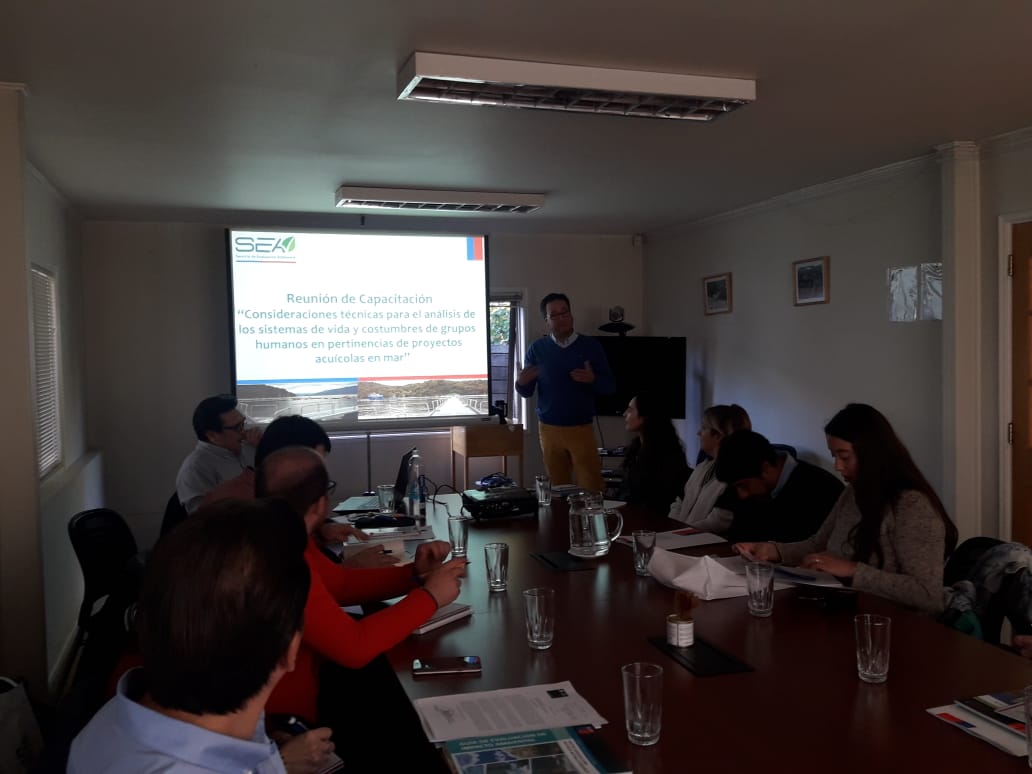 Con la finalidad de entregar lineamientos técnicos y conceptuales, en el marco de los antecedentes que deben presentar los proponentes, para efectos del análisis del literal g.3, se llevó a cabo una capacitación sobre “Consideraciones técnicas para el análisis de los sistemas de vida y costumbres de grupos humanos en pertinencias de proyectos acuícolas en mar”.