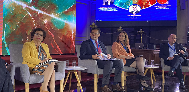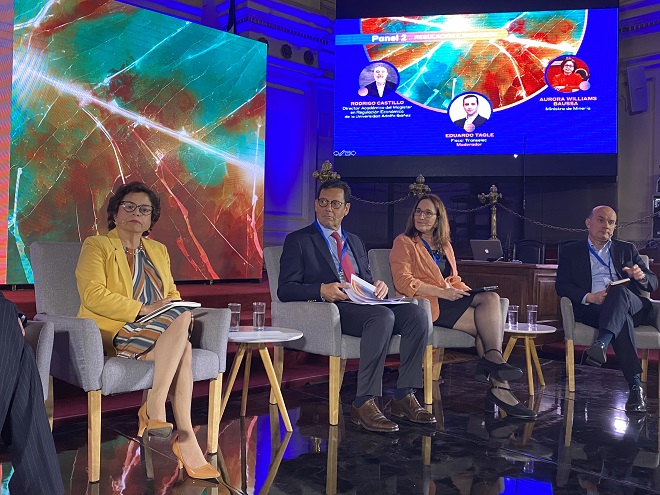 En el segundo panel, destinado a analizar materias de “Regulación e inversión”, tomaron parte el director académico del magíster en Regulación Económica de la Universidad Adolfo Ibáñez, Rodrigo Castillo; la ministra de Minería, Aurora Williams; el presidente ejecutivo del Consejo Minero, Joaquín Villarino; la directora ejecutiva del Servicio de Evaluación Ambiental, Valentina Durán; el director ejecutivo de Cesco, Jorge Cantallops, y el integrante de la Comisión de Minería y Energía, el senador Rafael Prohens.