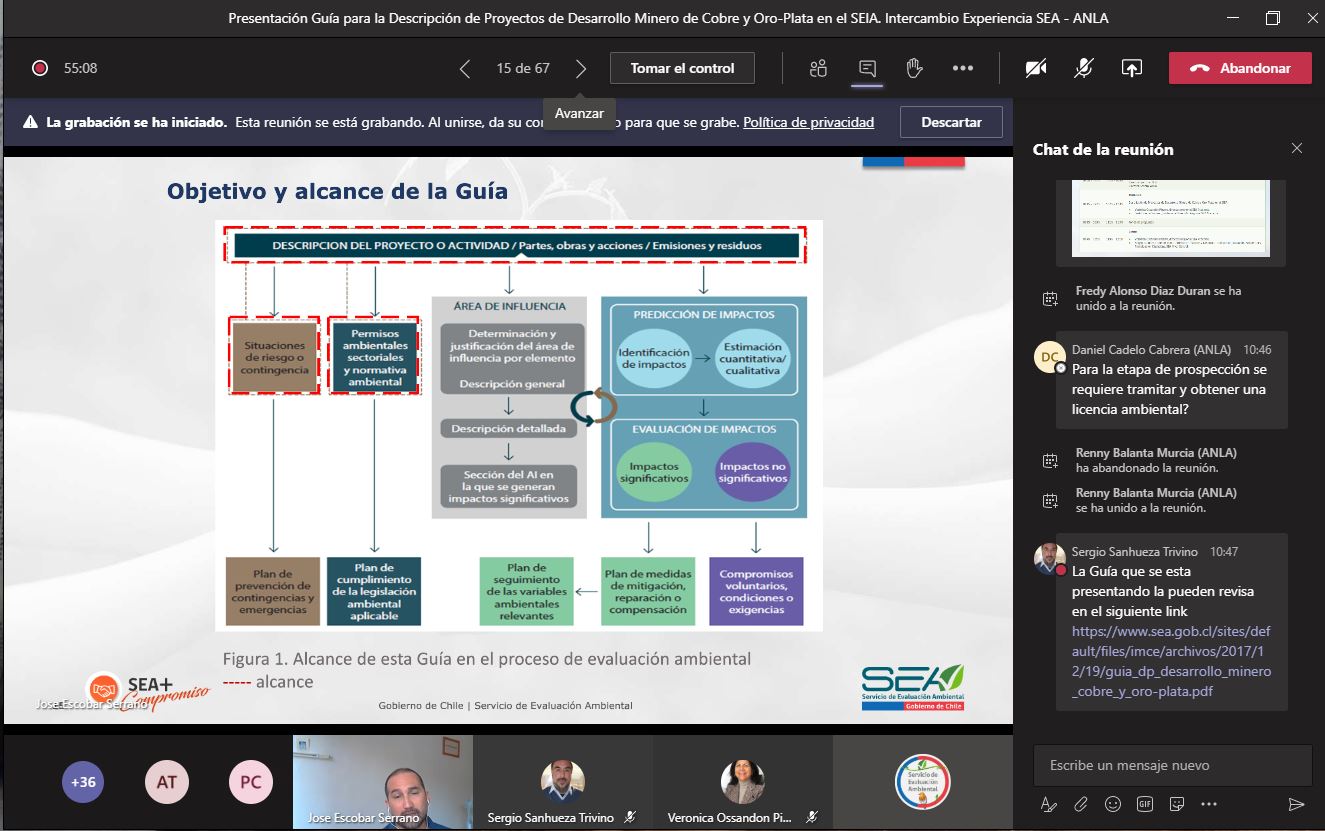 En este primer encuentro, en el que participaron más de 40 profesionales de Chile y Colombia, se contó con un saludo inicial por parte del director ejecutivo del SEA, Hernán Brücher, y por la subdirectora de Evaluación de Licencias Ambientales de la ANLA, Josefina Sánchez.