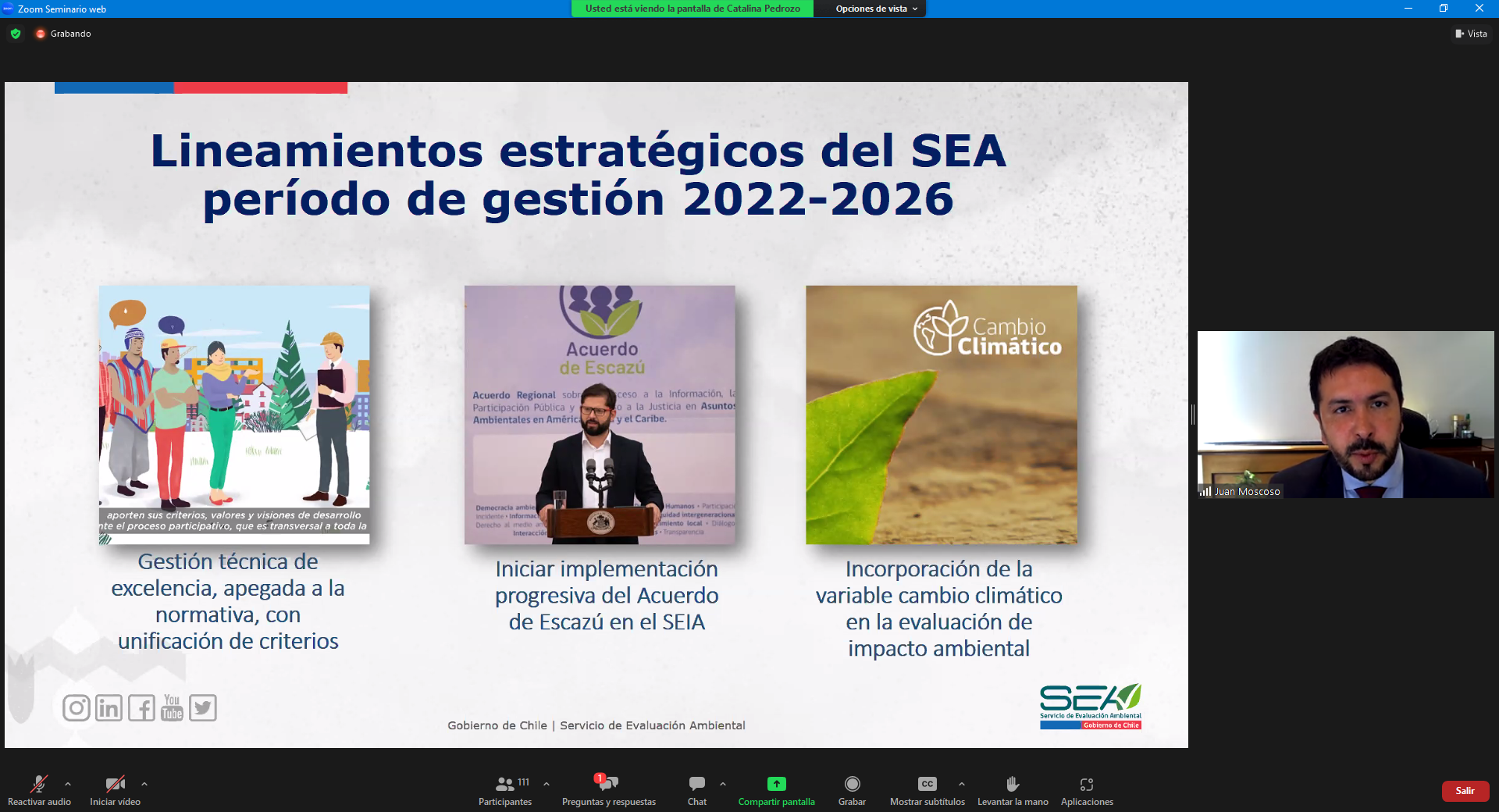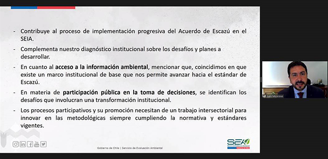 “Análisis para apoyar la aplicación del Acuerdo de Escazú en Chile”, fue el título del webinar organizado este jueves por el Ministerio del Medio Ambiente en conjunto con el Programa de las Naciones Unidas para el Medio Ambiente (PNUMA), y que tuvo como uno de sus panelistas al abogado Juan Cristóbal Moscoso, jefe de la División de Evaluación Ambiental y Participación Ciudadana del SEA.