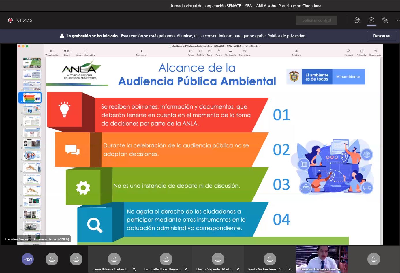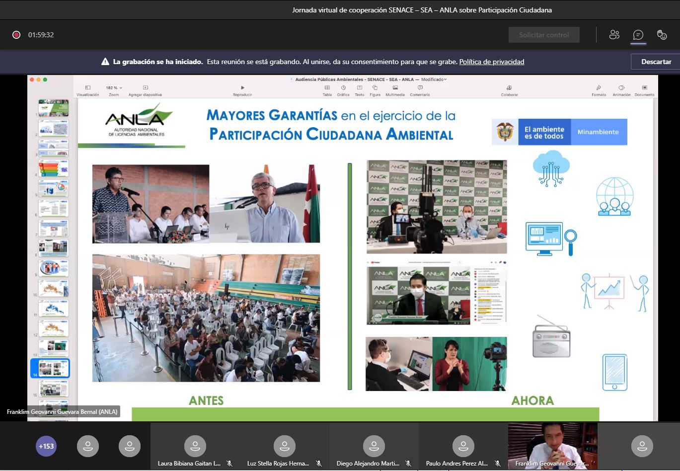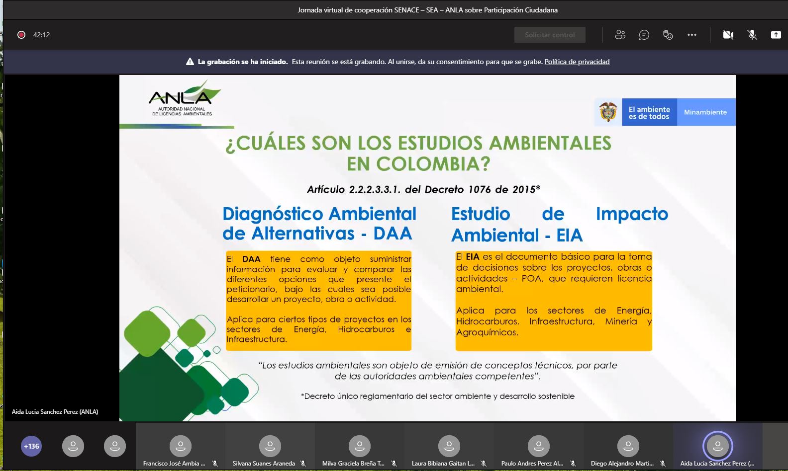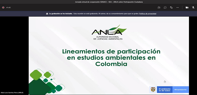 En el marco del desarrollo de competencias para el fortalecimiento de los Sistemas de Evaluación de Impacto Ambiental, el viernes 26 de marzo se llevó una nueva jornada virtual de cooperación entre las autoridades ambientales del Perú, Chile y Colombia, esto son el Servicio Nacional de Certificación Ambiental para las Inversiones Sostenibles (Senace), el Servicio de Evaluación Ambiental (SEA) y la Autoridad Nacional de Licenciamiento Ambiental (ANLA), respectivamente.