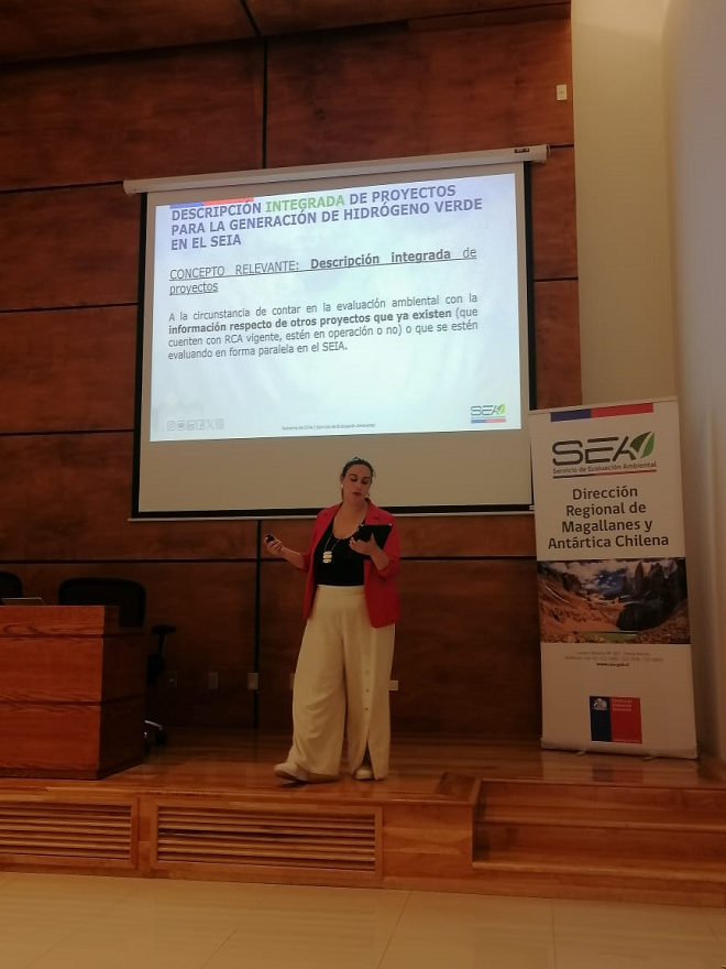Los profesionales de la División de Evaluación Ambiental y Participación Ciudadana (Devapac) del Servicio de Evaluación Ambiental (SEA), Macarena Gross —jefa del Departamento de Especialistas y Cambio Climático—, y Gino Olivares —del Departamento de Estudios y Desarrollo—, acompañados por el director regional del SEA Magallanes, José Luis Riffo, realizaron los días 3 y 4 de enero, dos jornadas de capacitación sobre hidrógeno verde y cambio climático.