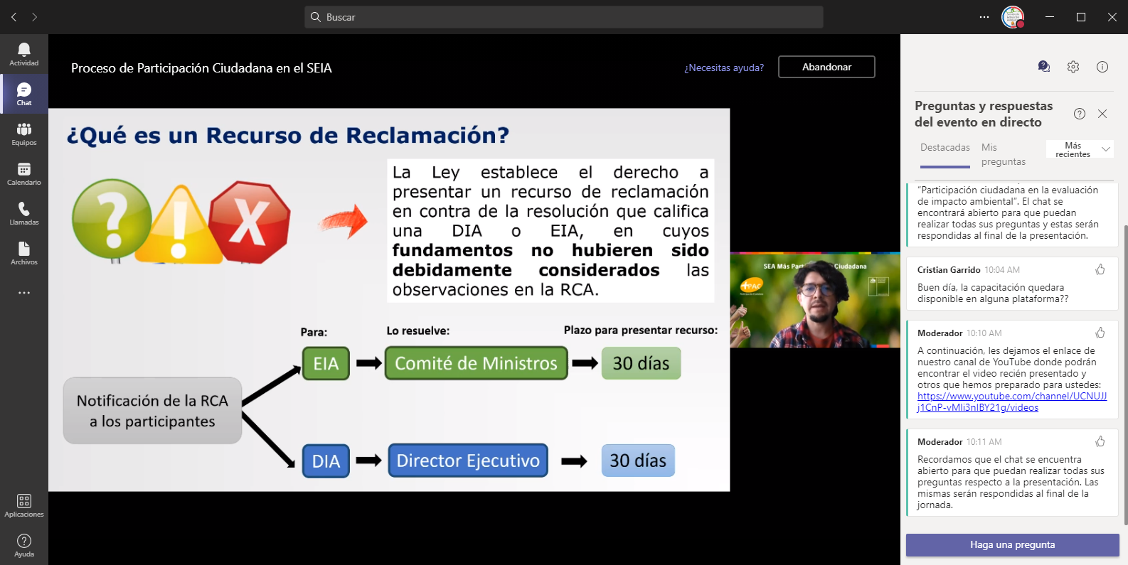 - Proceso de Participación Ciudadana en el SEIA, exposición a cargo de Hugo Fernando Huayquiñir, geógrafo y candidato a magíster en Hábitat Residencial de la Universidad de Chile, profesional del Departamento de Asistencia a Regiones, con experiencia en procesos de participación ciudadana, consulta indígena y la evaluación de proyectos en el SEIA.