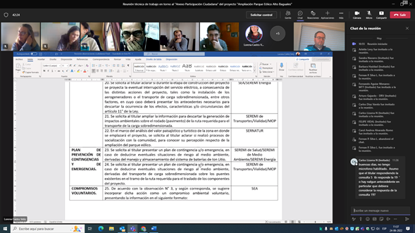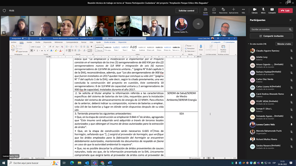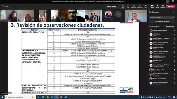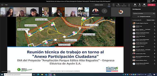 El viernes 24 de junio, la Dirección Regional del SEA Aysén llevó a cabo una reunión de trabajo con los funcionarios de los Órganos de la Administración del Estado con Competencia Ambiental (Oaeca), sobre las observaciones realizadas por la comunidad en el proceso de participación ciudadana en la Declaración de Impacto Ambiental del proyecto Ampliación Parque Eólico Alto Baguales.