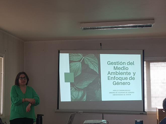 La exposición estuvo a cargo de Hayley Durán Bocaz, profesional de la Unidad de Equidad de Género de la Universidad de Aysén, y en ella se abordaron dos presentaciones referidas a “Géneros, cuerpos, sexualidades” y “Gestión del medio ambiente y enfoque de género”.