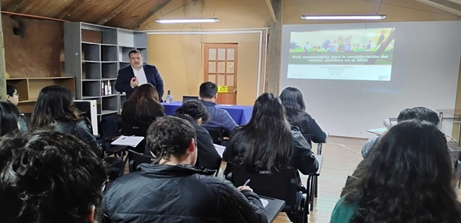 La exposición estuvo a cargo de Nelson Cortés, evaluador ambiental del SEA Biobío, quien compartió los aspectos esenciales y el enfoque del Servicio respecto a la incorporación del cambio climático en la evaluación del SEIA.