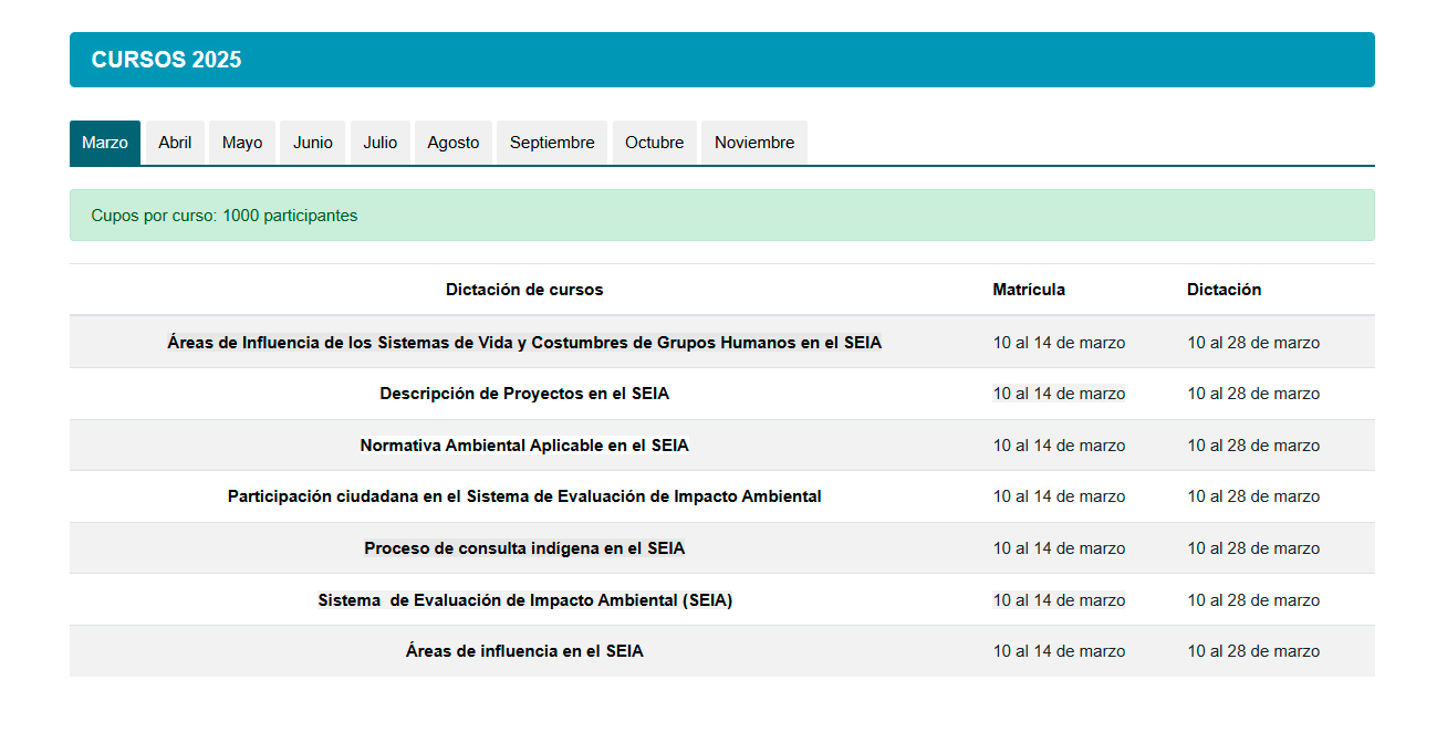 Este año contaremos con los cursos de Área de Influencia de los Sistemas de Vida y Costumbres de Grupos Humanos, Bases teóricas y metodológicas para la compensación de la biodiversidad, Descripción de proyectos, Descripción de centrales eólicas de generación de energía eléctrica en el SEIA, Evaluación ambiental de la calidad del aire, Introducción a la evaluación del componente hídrico, Normativa Ambiental Aplicable, Participación Ciudadana, Predicción y evaluación de impactos por ruido y vibración, Proceso de Consulta Indígena, Residuos y efluentes en el marco del SEIA, Sistema de Evaluación de Impacto Ambiental (SEIA), Área de Influencia