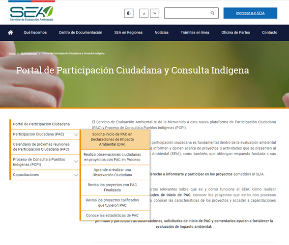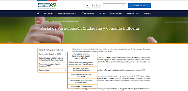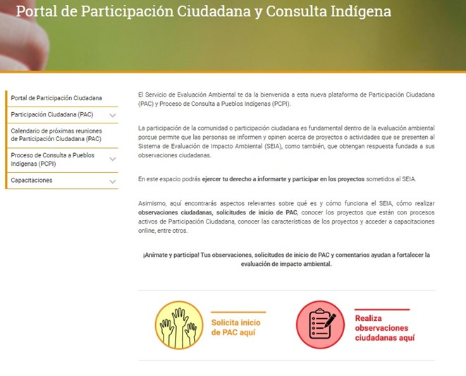 De igual manera, se reorganizó la información presente en los menús de navegación; se estandarizó la forma de presentación de los diferentes contenidos informativos; se generaron canales directos para que la ciudadanía pueda solicitar inicio de PAC, presentar sus observaciones ciudadanas, y se informe sobre las próximas reuniones de PAC; además de generar filtros de búsqueda para los diferentes contenidos informativos e incorporar información en los menús asociadas a los Procesos de Consulta a los Pueblos Indígenas (PCPI) en el SEIA, entre otros cambios.