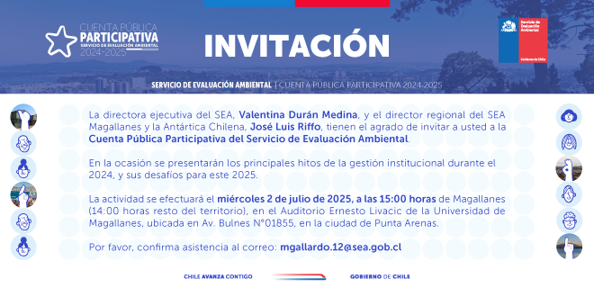 El Servicio de Evaluación Ambiental (SEA) invita a toda la ciudadanía a ser parte de su Cuenta Pública Participativa 2024-2025, instancia en la que se presentarán los principales avances de gestión del último período, así como los desafíos institucionales para el año en curso.