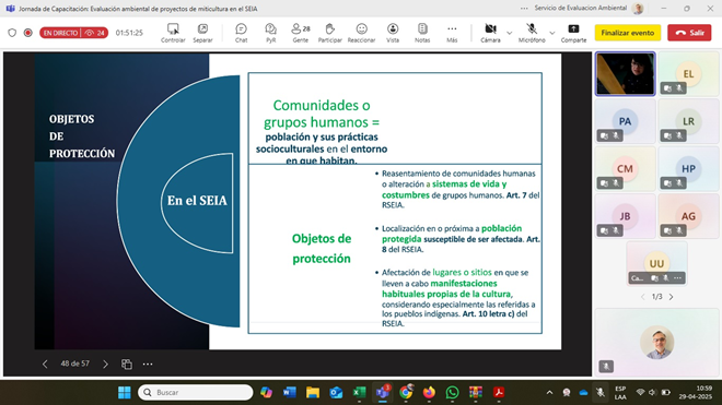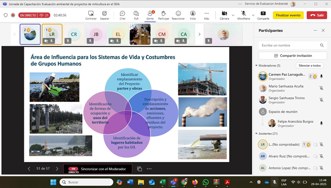Considerando la cantidad de proyectos de mitilicultura que son sometidos a evaluación ambiental en la Región de Los Lagos, así como aquellos aspectos que se han identificado más débiles en los procesos de evaluación, desde el equipo regional se levantó la necesidad de llevar a cabo este tipo de capacitación. Los contenidos de la presentación se enfocaron en aspectos generales de la evaluación ambiental, contenidos mínimos a considerar para someter un proyecto de mitilicultura al SEIA, información requerida para describir el componente medio humano y aspectos generales de la participación ciudadana en los procesos de evaluación.