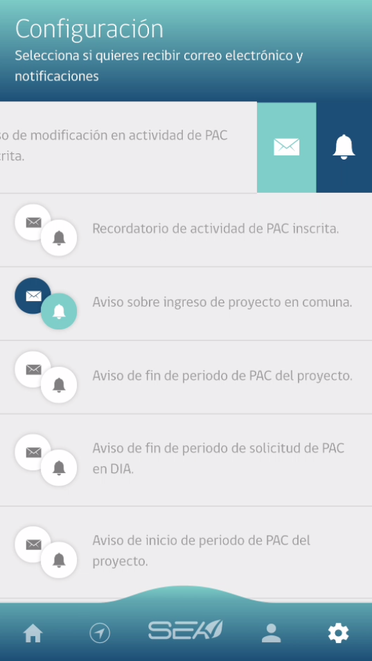 Los usuarios que descarguen “SEA Móvil” simplemente tienen que identificar qué tipo de avisos desean recibir, los que incluyen por ejemplo los ingresos de proyectos al SEIA en un área, comuna o región a elección; la publicación de documentos en el expediente de un proyecto de interés o bien, la programación de actividades de participación ciudadana en un proyecto o actividad determinada.