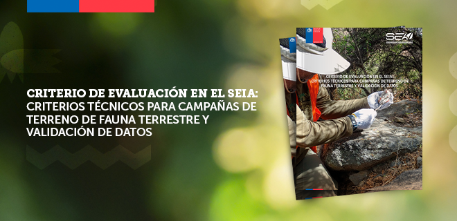 Se trata del documento denominado Criterio de Evaluación en el SEIA: Criterios Técnicos para Campañas de Terreno de Fauna Terrestre y Validación de Datos, y tiene por objetivo entregar lineamientos técnicos para la adecuada ejecución de las campañas de terreno en el proceso de elaboración de una Declaración o Estudio de Impacto Ambiental, previo a su ingreso al SEIA.