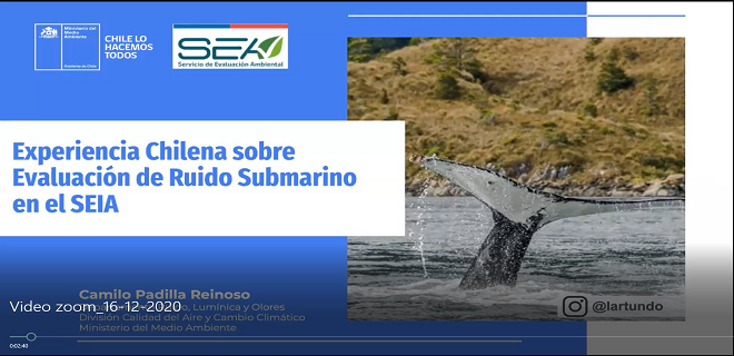 En esta oportunidad, el profesional Camilo Padilla, del Departamento de Ruido, Lumínica y Olores de la División Calidad del Aire y Cambio Climático del Ministerio del Medio Ambiente de Chile ofreció una exposición sobre "La experiencia chilena en la evaluación ambiental de Ruido Submarino".