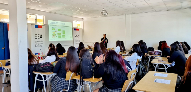 La segunda se realizó el 6 de noviembre en el Liceo Industrial Benjamín Dávila Larraín de la comuna de Renca, y se denominó “Formación de lideresas ambientales en el Sistema de Evaluación de Impacto Ambiental”. El taller estuvo dirigido a jóvenes de enseñanza media, con un enfoque de género, medio ambiente y gestión ambiental. Además de ofrecer conocimientos técnicos sobre el Sistema de Evaluación de Impacto Ambiental (SEIA), la capacitación buscó empoderar a las participantes, motivándolas a convertirse en lideresas que promuevan el cambio y la conciencia ambiental en sus comunidades. El SEA fue representado por las funcionarias Joseline Canio y Paulina Quinteros.