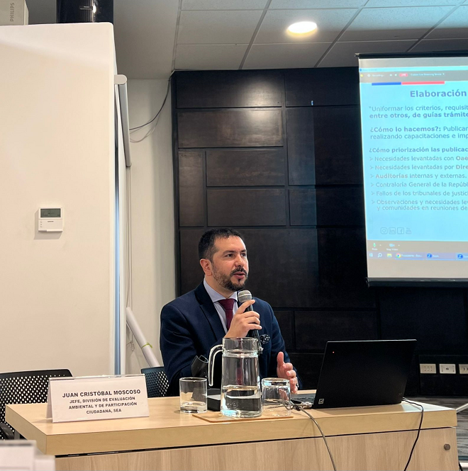 Moscoso detalló especialmente las funciones principales del Servicio de Evaluación Ambiental como administrador del SEIA, su mandato legal de unificar criterios, lo cual hace publicando guías, instructivos y criterios de evaluación, y también sobre rol de fomentar y facilitar la participación ciudadana. Asimismo, expuso sobre la Guía Metodológica para la Consideración del Cambio Climático en el SEIA, y el caso del cierre operacional de la Mina Cardenilla en la Región de Valparaíso.