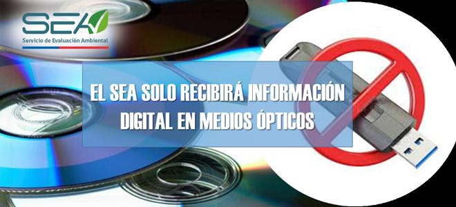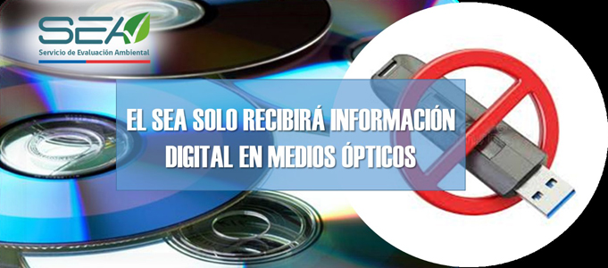 Si por razones justificadas, algún usuario requiere entregar al SEA información digital en archivos más grandes que el tamaño antes indicado, a contar del martes 20 de noviembre de 2018 las oficinas de este Servicio solo recibirán discos ópticos tales como CD o DVD debidamente sellados y sin posibilidad de reescritura, dejando de recibir cualquier tipo de memoria flash o con conexión USB (pendrives, tarjetas de memoria, discos externos, entre otros).