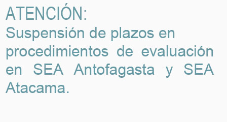Debido a la situación de emergencia registrada en Antofagasta y Atacama, a contar de hoy jueves 26 de marzo y hasta el día lunes 30 de marzo 2015 inclusive, se suspenden los plazos asociados a la totalidad de los procedimientos de evaluación de impacto ambiental, de revisión de resoluciones de calificación ambiental y sancionatorios, si los hubiese, y otros procedimientos administrativos que se encuentren actualmente en tramitación ante el Servicio de Evaluación Ambiental de la Región de Atacama y de la Región de Antofagasta.