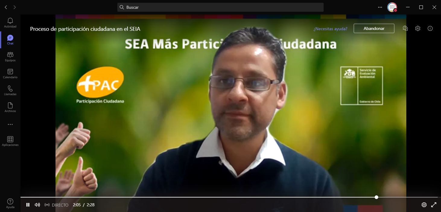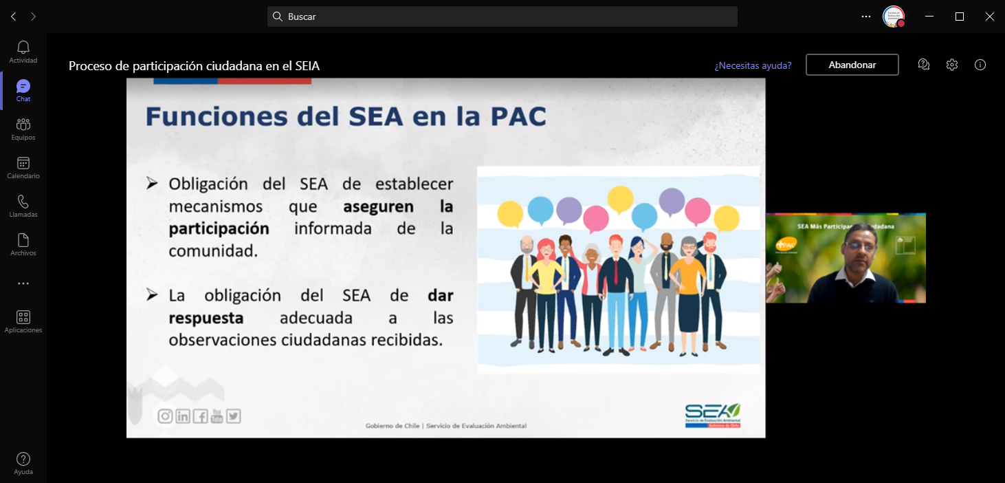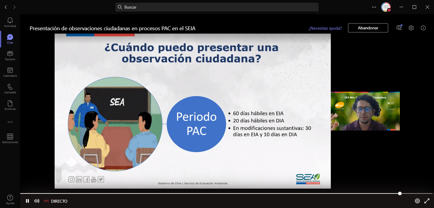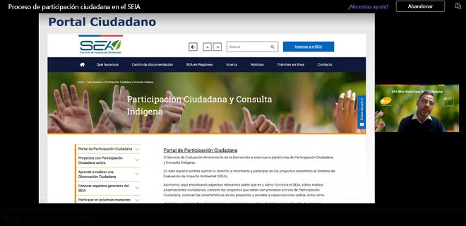 - Presentación de observaciones ciudadanas en procesos PAC en el SEIA, exposición a cargo del geógrafo Fernando Huayquiñir, profesional del Departamento de Asistencia a Regiones, con experiencia en procesos de participación ciudadana, consulta indígena y la evaluación de proyectos en el SEIA.