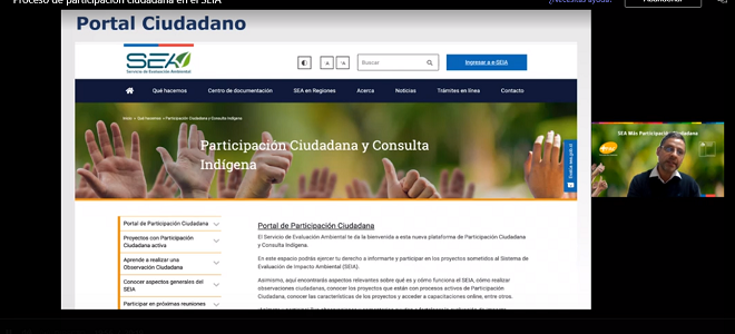 - Proceso de participación ciudadana en el SEIA, relatado por el antropólogo social Luis Pezo Orellana, profesional del Departamento de Evaluación Ambiental, especialista en temas de participación ciudadana, evaluación de medio humano y consulta indígena.