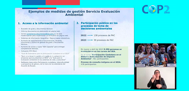 (Buenos Aires, Argentina) La directora ejecutiva del Servicio de Evaluación Ambiental (SEA), Valentina Durán, realizó este jueves una detalla exposición sobre las medidas y acciones implementadas en el SEA para la incorporación progresiva del Acuerdo de Escazú, todo ello, en el marco de la segunda reunión de la Conferencia de las Partes (COP 2) de dicho Acuerdo, que se está realizando en Buenos Aires, Argentina.