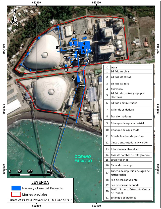 El presente proyecto solo contempla la fase de cierre. Los equipos y obras más relevantes que deberán ser retirados y/o desmantelados, corresponden a los siguientes: - Edificio turbina - Edificio de tolvas - Edificio caldera - Chimenea - Edificio de control y equipos eléctricos - Edificio administrativo - Taller de soldadura - Transformadores - Estanque de agua industrial - Estanque de agua cruda - Sala de bombas de petróleo - Cinta transportadora de carbón - Estacionamiento cubierto - Casa de bombas de refrigeración - Sifón (tubería) - Silo de cenizas volante - Silo de cenizas de fondo - MAC (Sistema Extracción Ceniza de Fondo) - Estanque de petróleo