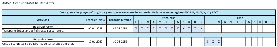 El proyecto no contempla la ejecución de obras civiles ni la intervención en infraestructura vial, utilizando rutas existentes y autorizadas. Las actividades de mantención de vehículos y equipos serán completamente externalizadas y se realizarán en instalaciones de terceros, por lo que no forman parte del alcance directo del Proyecto. Asimismo, las actividades administrativas no se incluyen en esta descripción, ya que el foco del Proyecto está centrado en la operación logística y de transporte. En cuanto a las obras físicas, el Proyecto utilizará exclusivamente instalaciones ya existentes, sin considerar modificaciones, ampliaciones, remodelaciones ni construcción de nueva infraestructura. Esto asegura que el desarrollo del Proyecto se realice dentro de un marco operativo previamente habilitado, sin generar impactos adicionales asociados a obras físicas. Por lo tanto, el Proyecto no contempla una etapa de construcción. Su desarrollo se estructura en las siguientes fases: • Fase de operación: Inicia con el despacho del primer vehículo de transporte y se extiende durante toda la vida útil del Proyecto. • Fase de cierre: Corresponde al término de las actividades de transporte y la formalización del cierre mediante la documentación correspondiente ante las autoridades competentes. Mientras que el cronograma de las fases se describe de la siguiente manera: