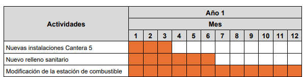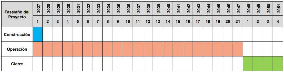 Fuente: DIA, cronograma Fase de Operación del Proyecto, pág. 86. • Fase de Cierre: La Fase de Cierre comenzará tentativamente a inicio del año 2048 al cese de la operación, con el cierre de las instalaciones, finalizando el año 2051.El inicio de la fase cierre del Proyecto se llevará a cabo el primer trimestre de 2048 con la desenergización de las instalaciones mientras que el termino estimado se calcula para el cuarto trimestre de 2051 con el cierre de caminos de acceso a la faena minera. Mientras que el cronograma de las fases se describe de la siguiente manera: