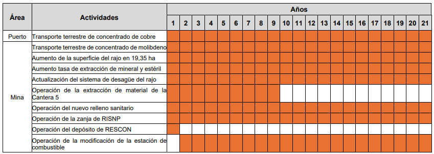 Fuente: DIA, Cronograma Fase de Construcción del Proyecto, pág. 52. • Fase de Operación: Esta se prevé que se lleve a cabo en un plazo máximo de 21 años, a partir del quinto año de operación de QB2. El hito de inicio será el comienzo de las operaciones del transporte terrestre de concentrado de cobre desde el Área Puerto hacia los destinos establecidos en la Región de Antofagasta. Mientras que el hito de finalización de esta fase corresponde al último embarque o la salida del último transporte de concentrado de cobre desde el Área Puerto.