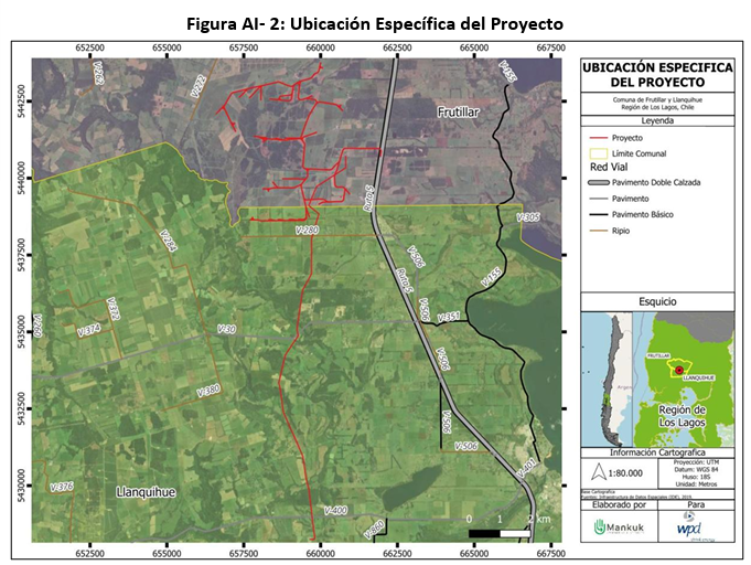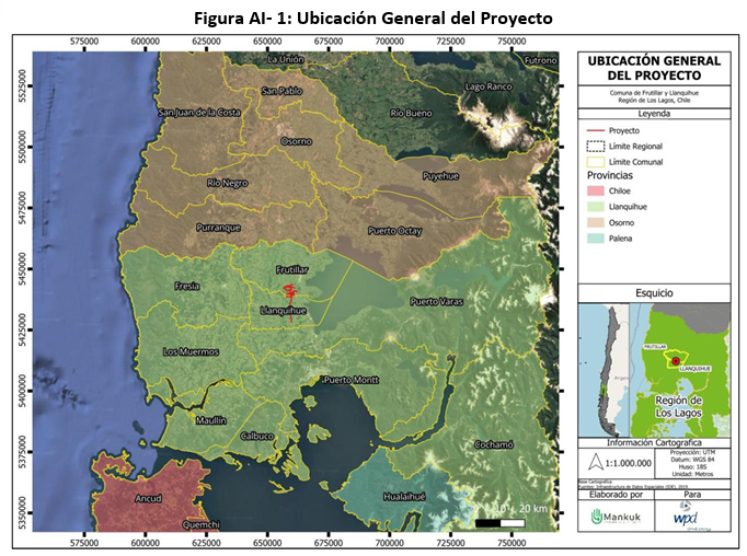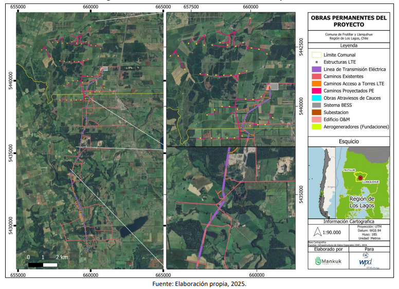 El proyecto consiste en la construcción y operación de un parque eólico, emplazado en las comunas de Frutillar y Llanquihue, provincia de Llanquihue, región de Los Lagos, que contempla la instalación de 40 aerogeneradores de 8 MW de potencia unitaria, alcanzando una potencia instalada total de 320 MW. El proyecto incluye, además, una Línea de Transmisión Eléctrica (LTE) de aproximadamente 13,8 km de longitud, una subestación eléctrica elevadora, caminos de acceso, plataformas, obras civiles asociadas y un sistema de almacenamiento de energía en baterías (BESS) de 320 MW, conectándose al Sistema Eléctrico Nacional a través de la subestación eléctrica Tineo.