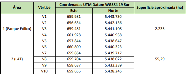 Fuente: Tabla DP – 2 del Capítulo 1: Descripción del proyecto Parque eólico Trumao, página 10.