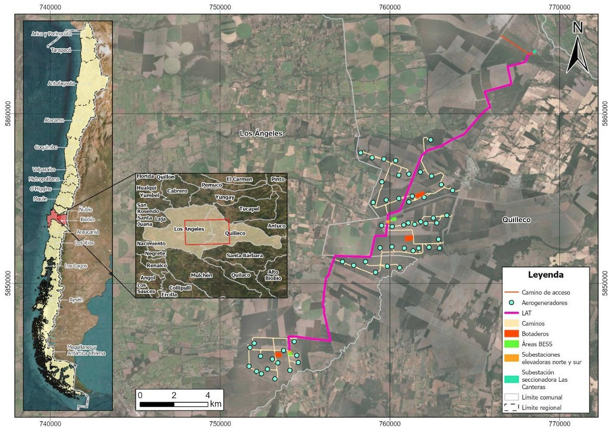 El Proyecto es interregional y sus partes y obras se emplazarían en una superficie aproximada de 329 ha en las comunas de Quilleco y Los Ángeles, Región del Biobío, considerando además el transporte de insumos por vías públicas que atraviesan las comunas de Quilleco, Los Ángeles, Tucapel, Cabrero y Yungay, esta última de la Región de Ñuble. |