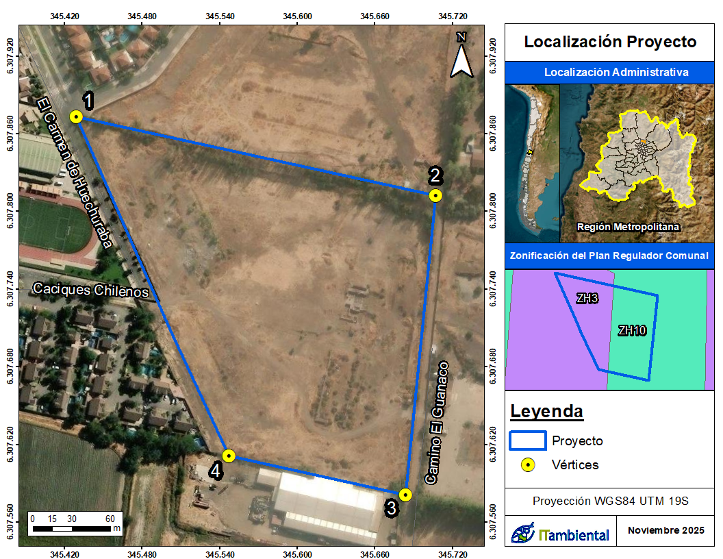 El Proyecto se localiza en la Región Metropolitana, Provincia de Santiago, comuna de Huechuraba; específicamente en Calle Guanaco 7188. Se localiza dentro de la zona urbana de la comuna. El área o zona en la que se emplaza el Proyecto es un área denominada “Zona ZH10” correspondiente a Residencial (Altura Media) y ZH3 Zona Residencial (Santa Rosa de Huechuraba - Santa Clara) de acuerdo con el Plan Regulado Comunal, que permite uso: residencial (vivienda, hospedaje); equipamiento (comercio, culto y cultura, deporte, educación, esparcimiento, salud, seguridad, servicios, social) y área verde.