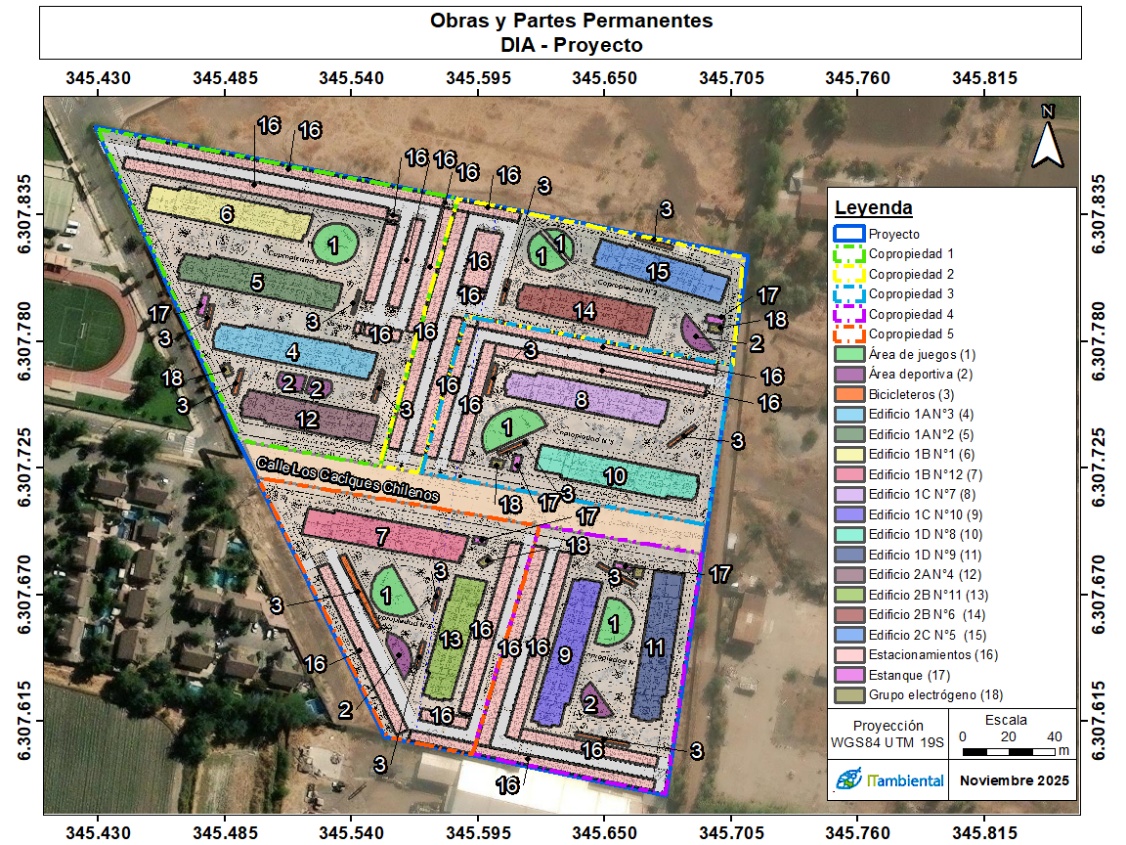 · Partes y obras que componen el Proyecto – Fase de Operación Edificaciones: El Proyecto corresponde a la construcción y operación de un proyecto con destino habitacional enmarcado en el programa Fondo Solidario de Elección de Vivienda DS49 e incluido en el plan de emergencia habitacional, contempla la construcción de 12 torres residenciales de entre 4 y 6 pisos de altura, además de 5 locales comerciales. Incorpora un total de 566 viviendas, además de una dotación de 562 estacionamientos de vehículos con destino residencial distribuidos en superficie y 328 estacionamientos de bicicletas con destino residencial. Estacionamientos: En cuanto a la cantidad de estacionamientos del Proyecto, se aclara que contempla un total de 562 estacionamientos, 10 de ellos son estacionamientos para personas con movilidad reducida y 85 estacionamientos para visitas. Sala de Basuras: Para los residuos sólidos domiciliarios se ha establecido un sistema de recolección que conduce hacia diferentes salas de basuras ubicadas en el primer piso de cada edificio. Existe un total de 12 salas de basuras para la totalidad de los edificios del Proyecto. De acuerdo con lo anterior, se estima que generarán un total de 9.024 L/día de residuos sólidos sumado todo el proyecto. Edificación con destino equipamiento: El Proyecto contempla la construcción de 5 locales comerciales. Lotes: El Proyecto se emplazará en un terreno bruto de 51.739,17 m2. contempla 11.469,02 m2 de área afecta a utilidad pública, los cuales comprenden la apertura de la Calle Caciques Chilenos y ensanche por Calle El Carmen de Huechuraba, así como el ensanche por Av. El Guanaco según establece el PRC (Ver CIP en el Anexo N°2. Documentos de la DIA). Vialidad interna: La vialidad interna corresponde a los caminos que se emplazan al interior del proyecto para uso de tránsito vehicular de los residentes, considerando el acceso a viviendas y estacionamientos. Vialidad externa: Si bien el Proyecto no contempla construcción de vialidad fuera de los limites prediales, debe realizar la apertura de la Calle Caciques Chilenos y ensanche por Calle El Carmen de Huechuraba, así como el ensanche por Av. El Guanaco, que es en área afecta a utilidad pública. Infraestructura de agua potable y Alcantarillado: El sistema de abastecimiento de agua potable será mediante estanques de acumulación, desde donde se distribuirá el agua mediante electrobombas de agua potable a los diferentes departamentos. Los estanques estarán conectados a la red pública. Para el alcantarillado, las instalaciones interiores de alcantarillado se ejecutarán en tuberías de PVC rígidos según norma. Las uniones y accesorios deberán también cumplir con esta norma. Los diámetros serán los establecidos por los planos del proyecto de la especialidad, de acuerdo con el Certificado de Factibilidad de Agua Potable y Alcantarilladlo del Anexo N°2 de la DIA.